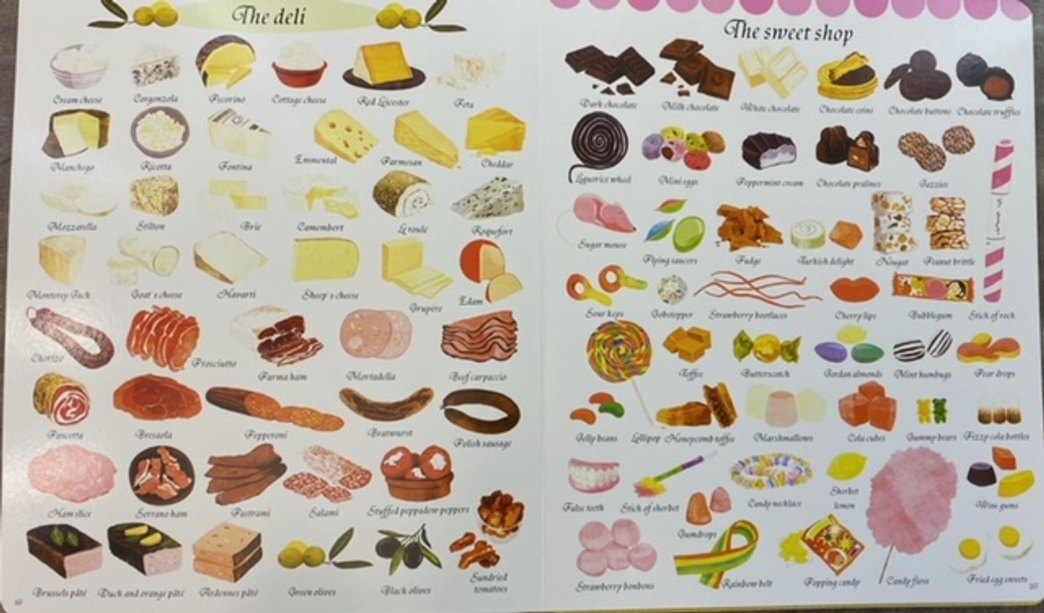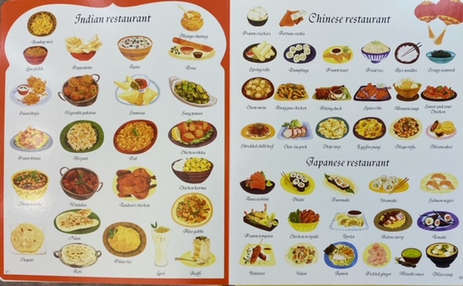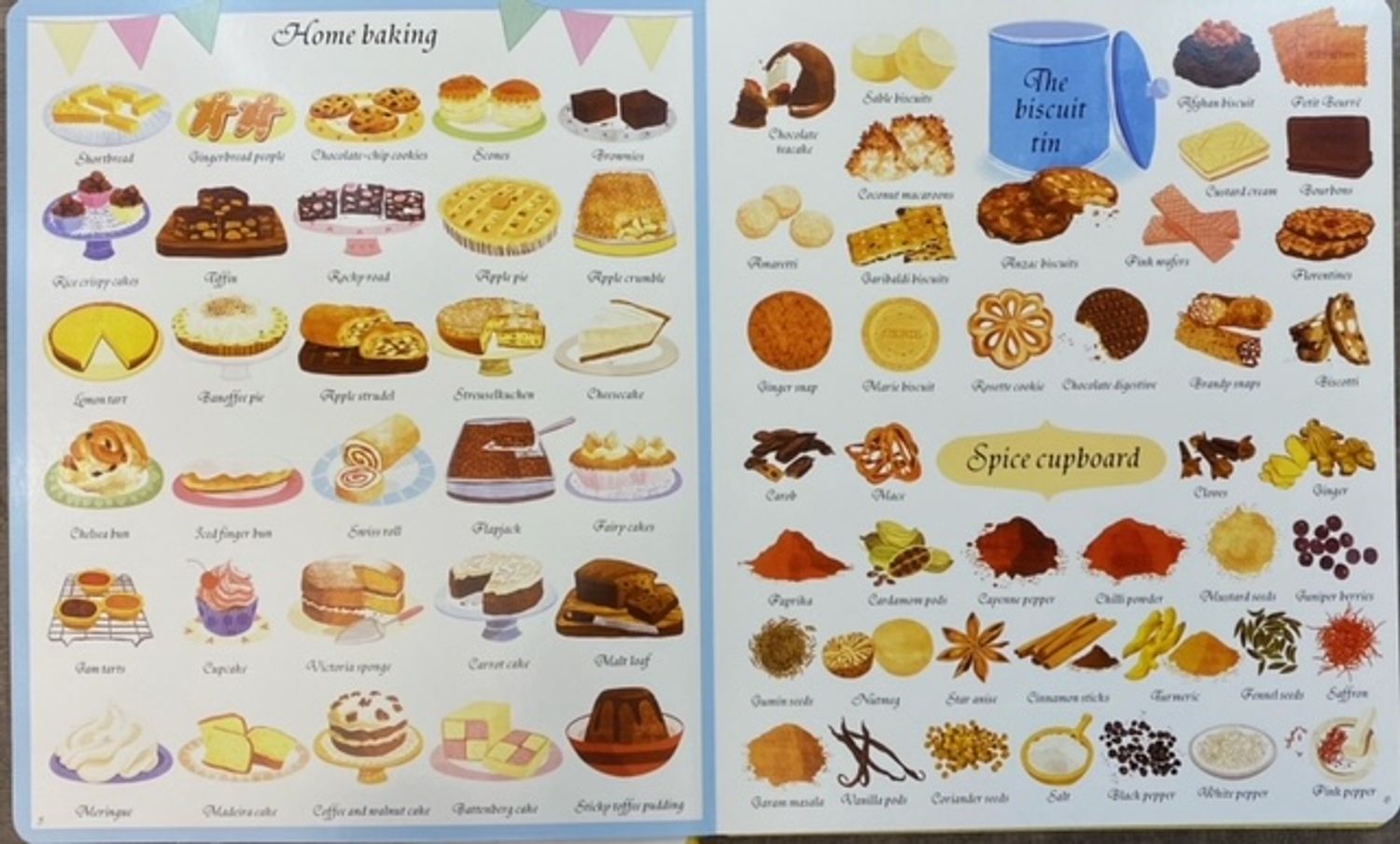 Usborne хэвлэлийн газраас эрхлэн гаргасан Usborne “1000 Things to eat” номонд нийт 1000 хоол унд, жимс ногоо идэх зүйлсийн нэрсийг зургийн хамт оруулсан байдаг. Эдгээр хоол хүнсний нэрсийг:
