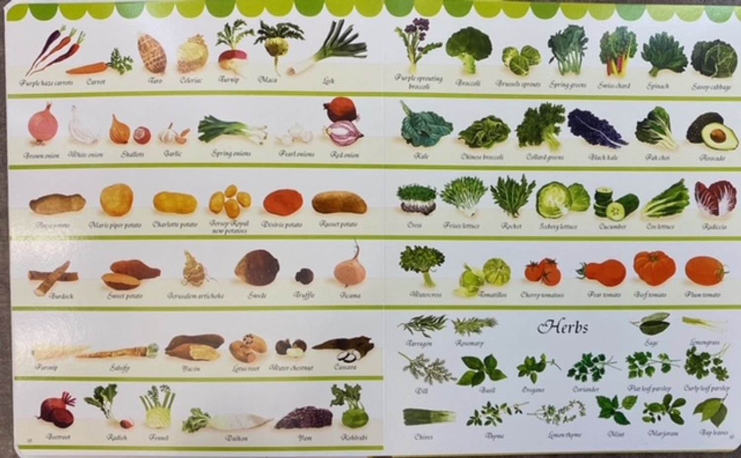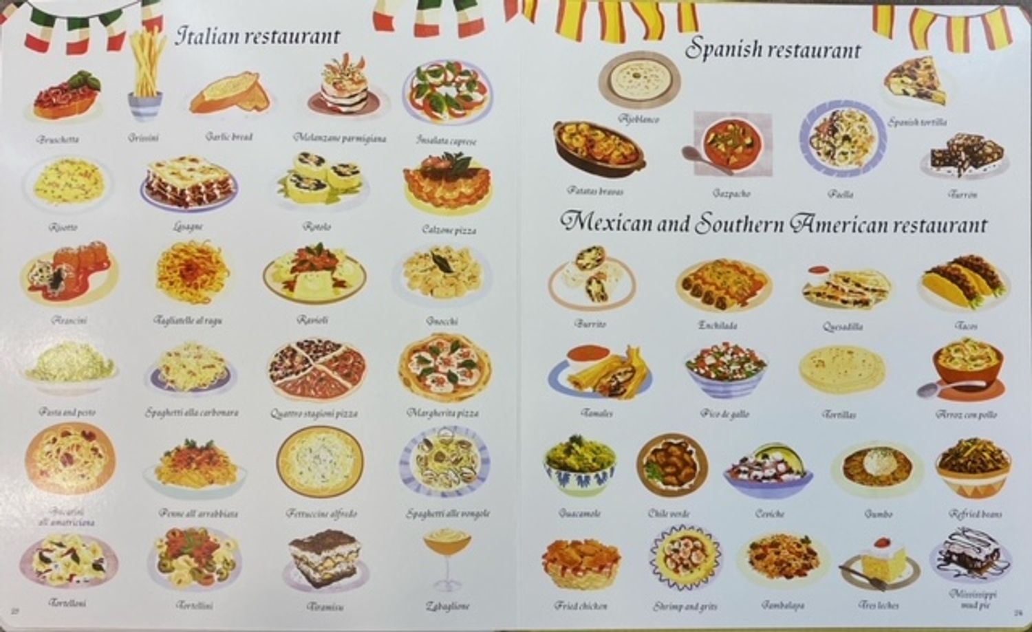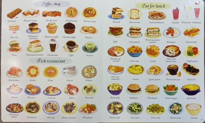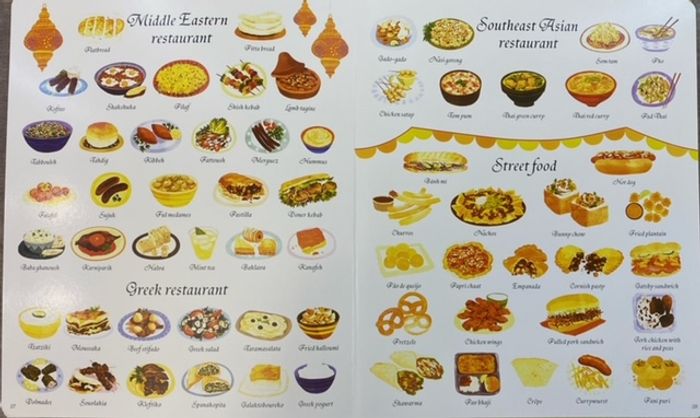 Usborne хэвлэлийн газраас эрхлэн гаргасан Usborne “1000 Things to eat” номонд нийт 1000 хоол унд, жимс ногоо идэх зүйлсийн нэрсийг зургийн хамт оруулсан байдаг. Эдгээр хоол хүнсний нэрсийг: