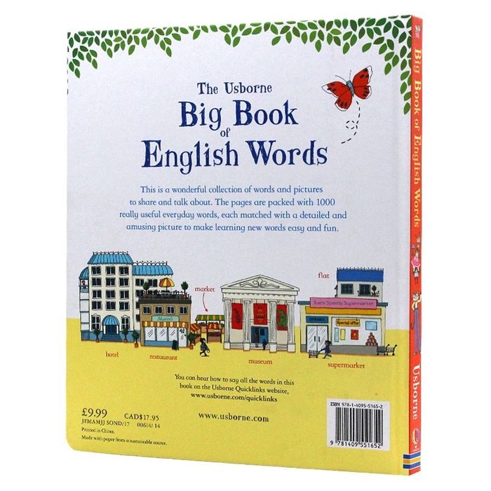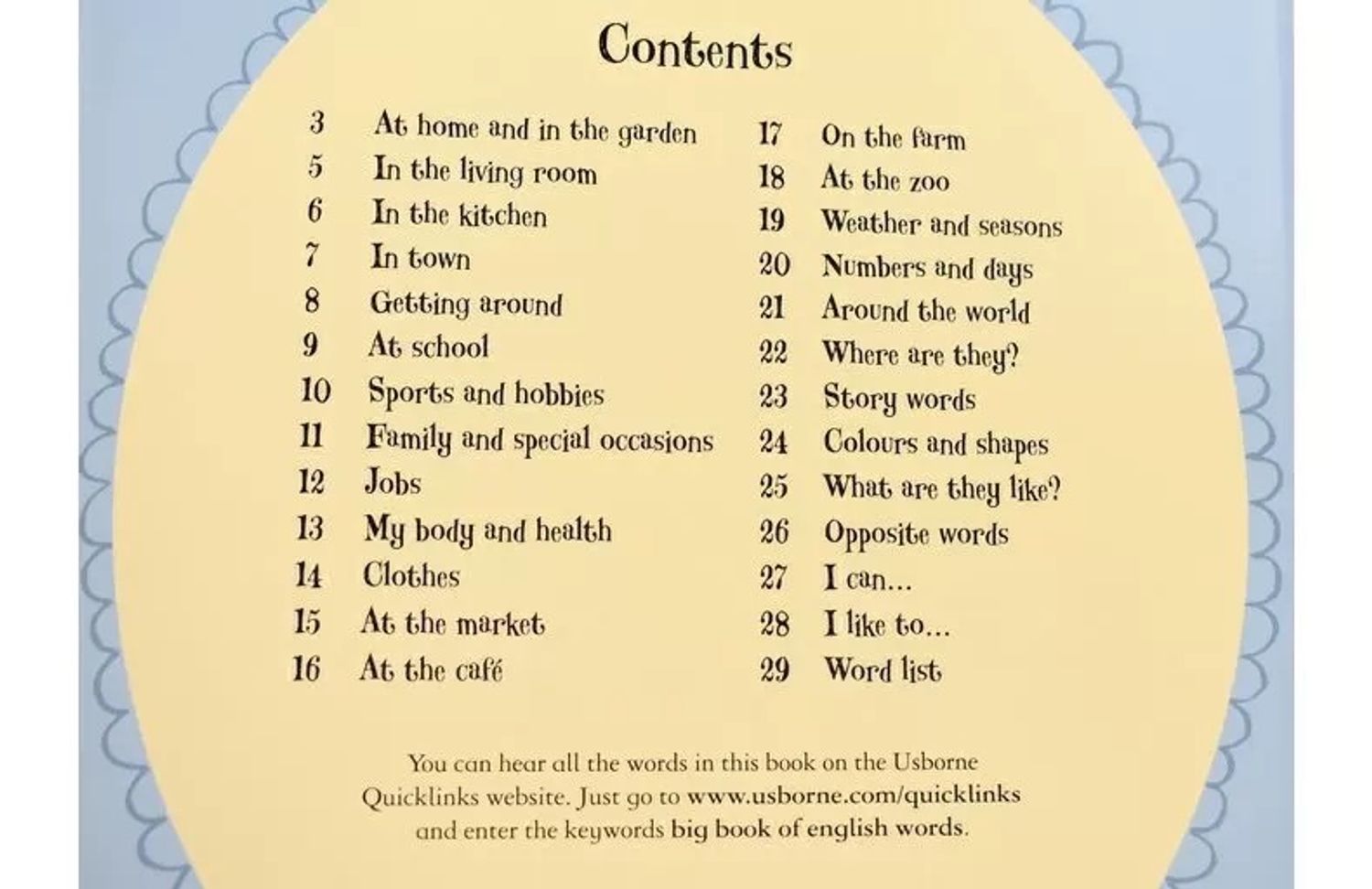 "Big Book of English Words" бол хүүхдүүдийн үгсийн санг баяжуулахад зориулсан зурагт толь бичиг юм. Энэхүү номд өдөр тутмын амьдрал, байгаль, амьтан, гэр, сургууль, биеийн хэсэг зэрэг олон сэдвийг хамарсан 1000 гаруй үг багтдаг. Том, өнгөлөг зураг, тод бичиглэл нь хүүхдүүдийг сонирхолтой байдлаар үг цээжлэхэд тусалдаг. Үг бүр бодит орчинд хэрэглэгддэг байдлаар байршуулсан тул сурагчид үгний утга, хэрэглээг зэрэг ойлгох боломжтой. Ном нь уншлага, хэлний анхан шатны сургалт, гэр бүлийн хамт уншихад нэн тохиромжтой боловсролын хэрэгсэл юм.