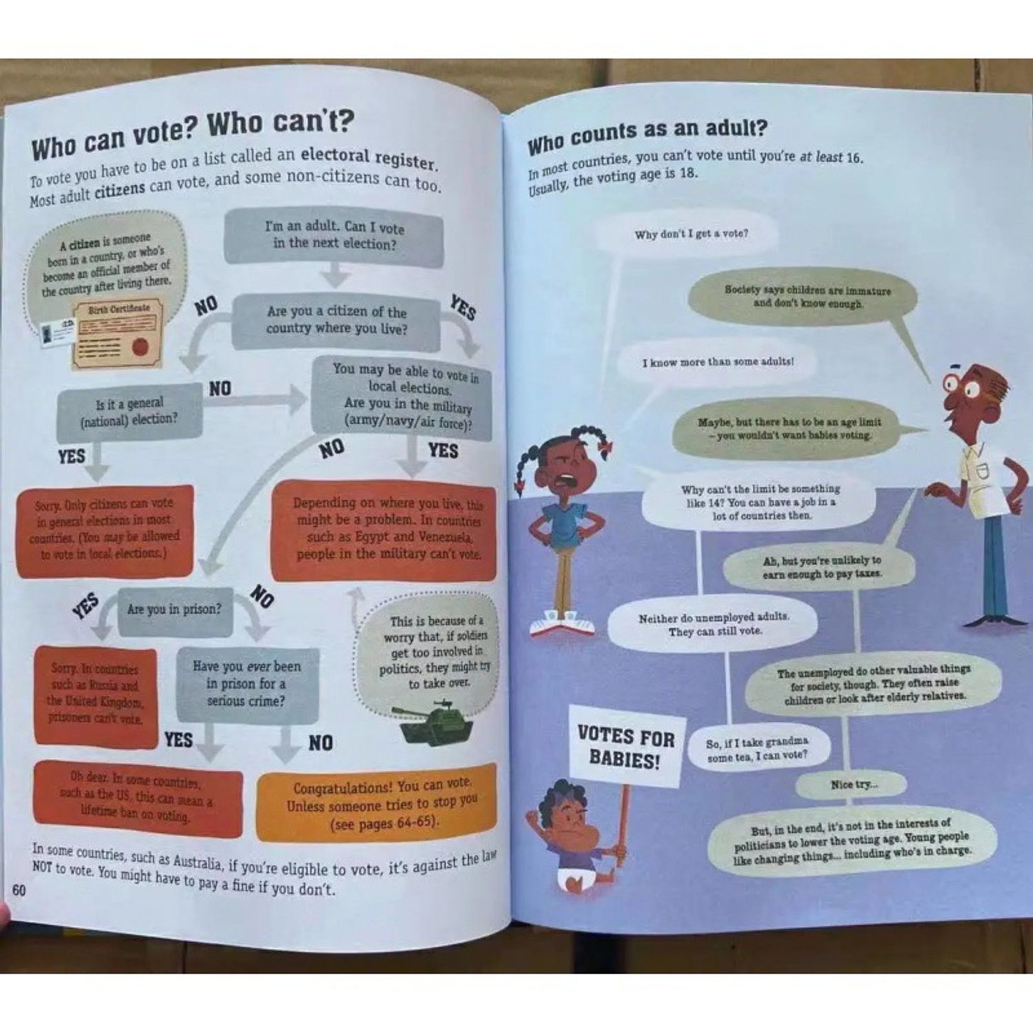 Улс төрийн тогтолцоо, засгийн газар, сонгууль, санал хураалт, феминизм, хүний эрх, үг хэлэх эрх чөлөө, хуурамч мэдээ зэрэг асуудлуудыг тодорхой текст, тод, инфографик хэв маягаар маш энгийн, ойлгомжтой тайлбарласан болно.